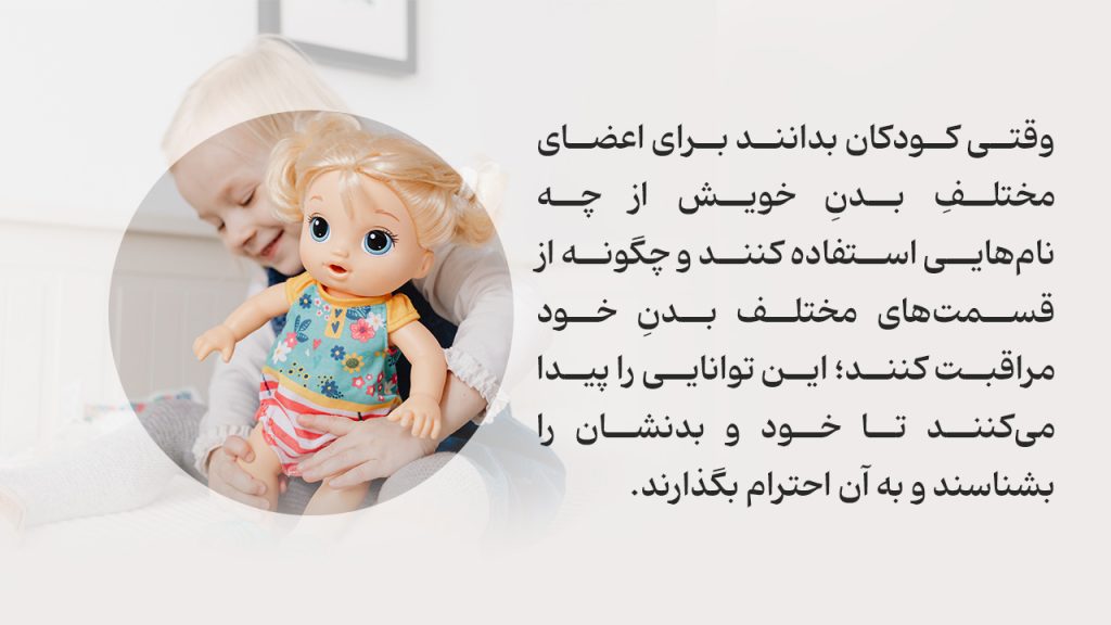وقتی کودکان بدانند برای اعضای مختلفِ بدنِ خویش از چه نامهایی استفاده کنند و چگونه از قسمتهای مختلف بدنِ خود مراقبت کنند؛ این توانایی را پیدا میکنند تا خود و بدنشان را بشناسند و به آن احترام بگذارند.